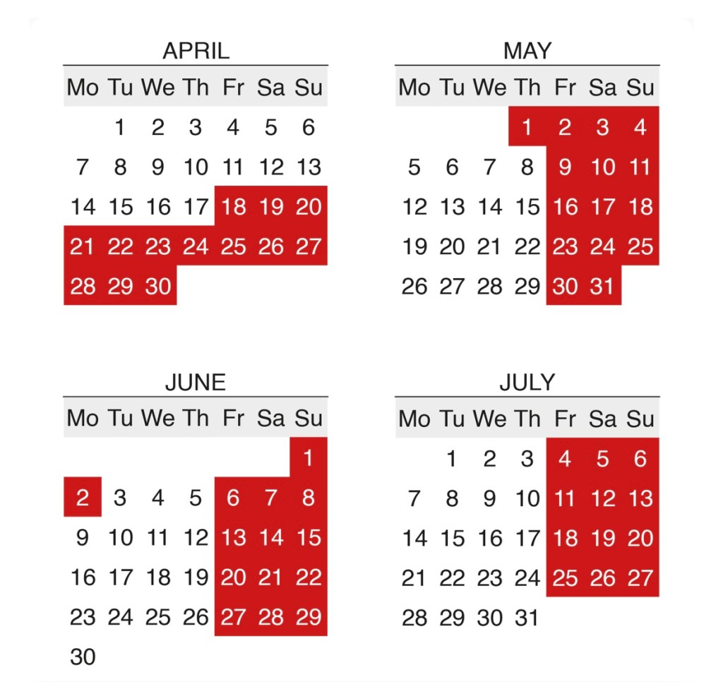 - The weekends of June 6th – 8th, 13th -15th, 20th – 22nd, and 27th – 29th.